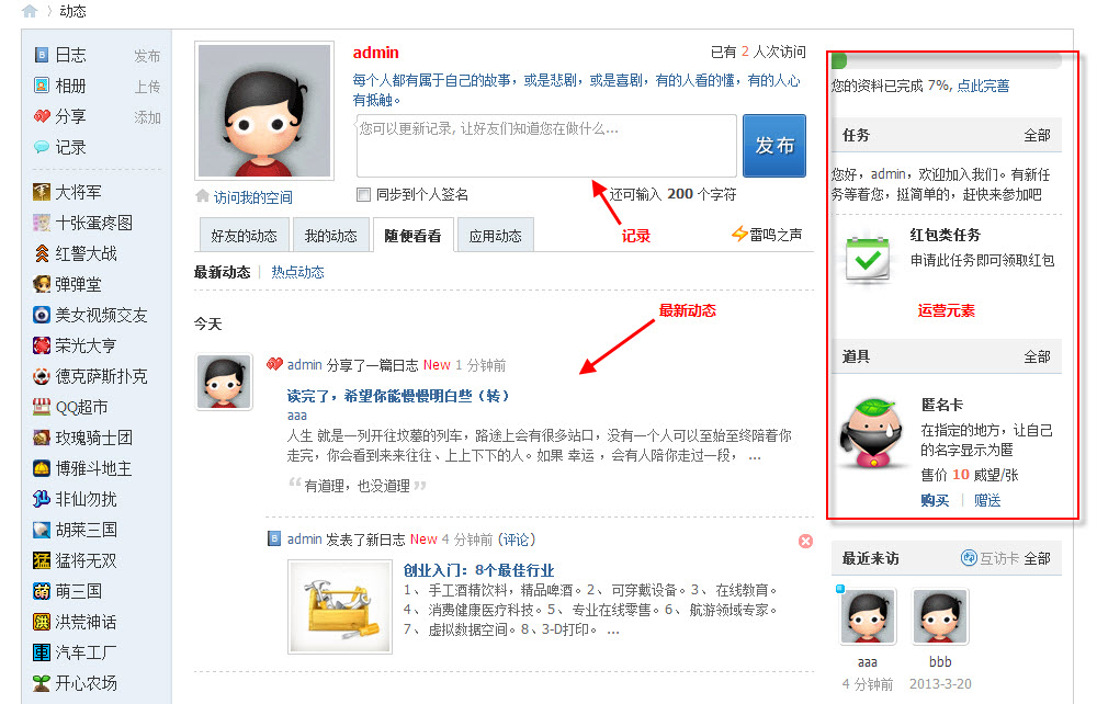 好友动态页面核心元素是展示好友动态以及发表记录,同时,页面左侧提供了家园的功能导航,右侧提供了任务、道具等运营元素的展示。如下图:
