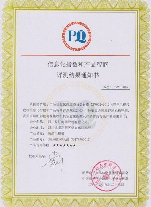 PIQ产品智商认证,是在工业和信息化部等相关部门的大力支持下,消费电子产品信息化推进委员会发布的智能电视行业中首个产品智商水平评测标准。所谓PIQ认证,主要是基于对产品智商的研究,通过对彩电产品的信息化装备、易用性、功能、专家系统、人工智能等方面的63项指标进行综合评估而得出产品智商等级结果,旨在为消费者选购智能电视提供参考依据。